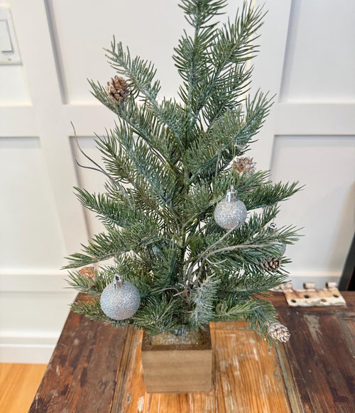 Bring cozy holiday charm to any space with this mini Christmas tree in a rustic wood box base. Lush frosted pine branches are dotted with tiny pinecones and finished with glittering silver ornaments for a subtle sparkle that works with any color palette. Perfect for a mantel, desk, kitchen counter, bedroom, or entryway, this small tree is an easy way to add Christmas decor to tight spaces. Use it as a tabletop centerpiece on its own or pair it with candles and greenery for a festive winter vignette you can enjoy all season long.
